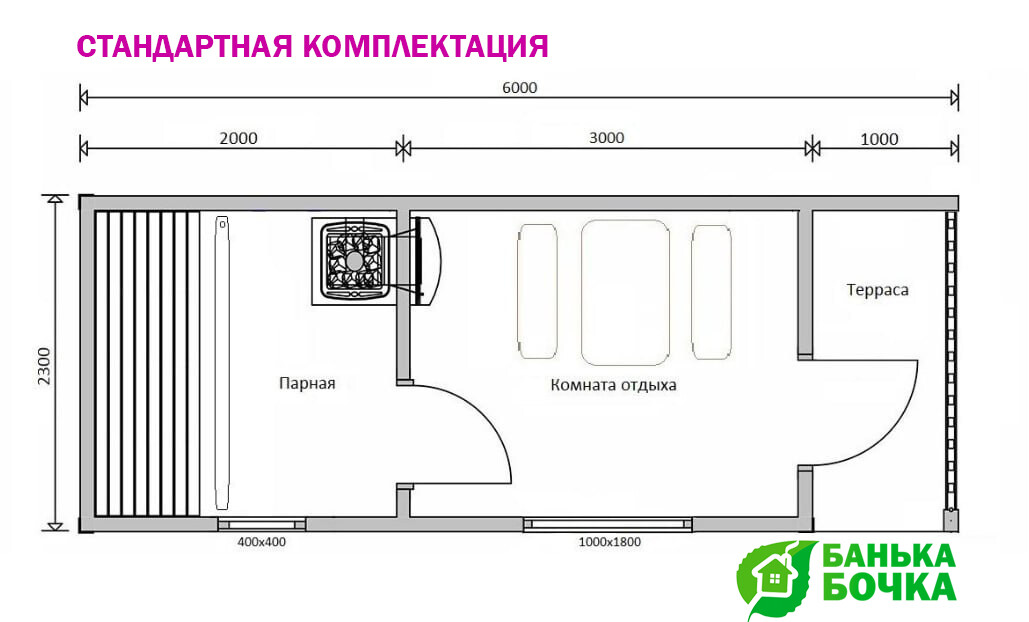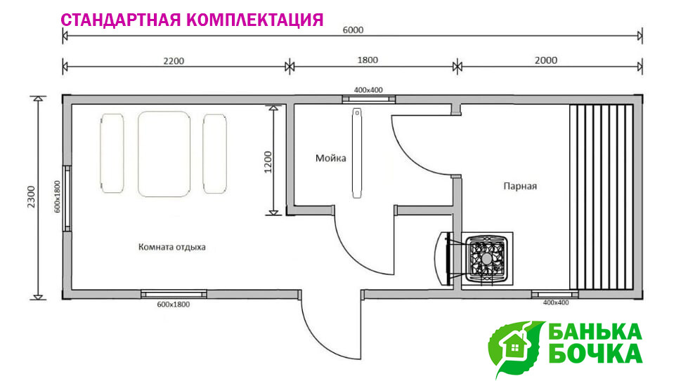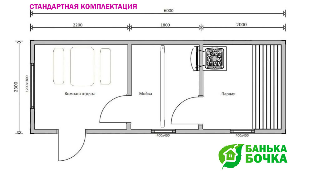 Размер бани: 6 х 2.3 м