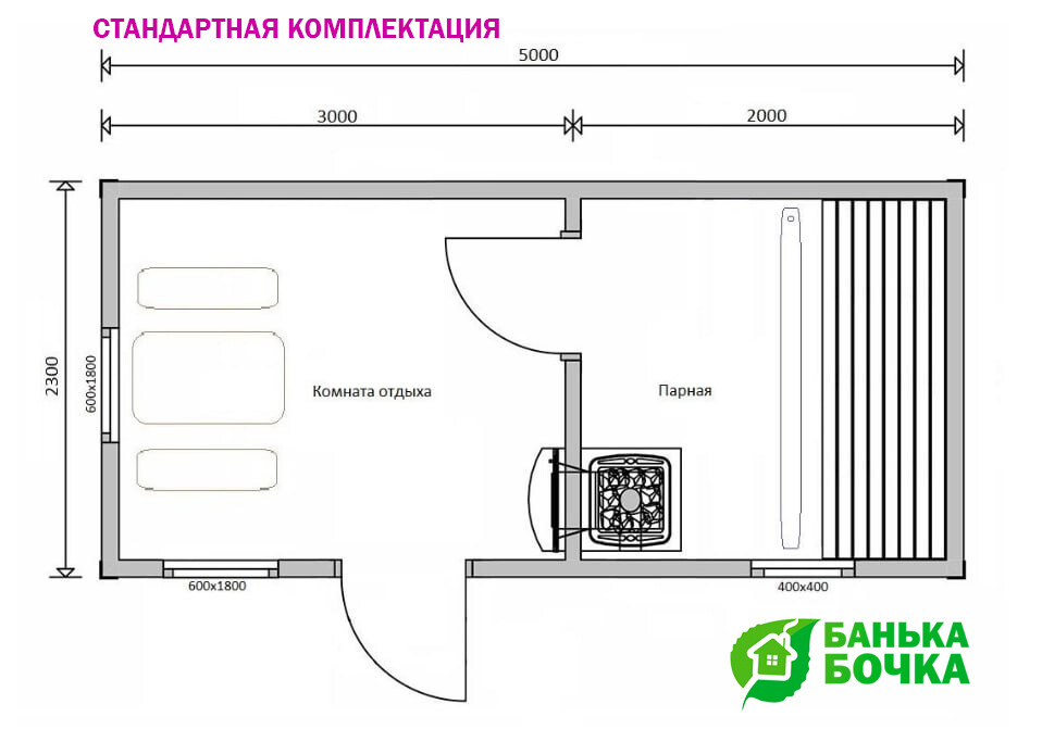 Размер бани: 5 х 2.3 м