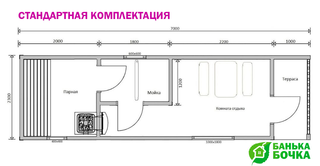 Размер бани: 7 х 2.3 м