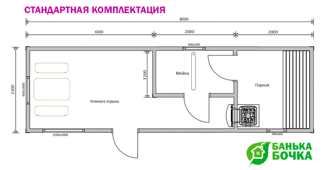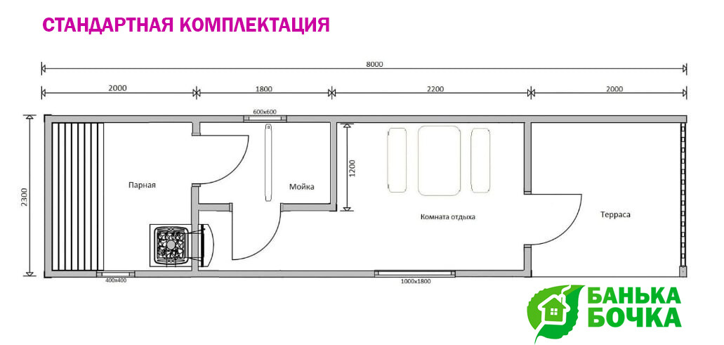 Размер бани: 8 х 2.3 м