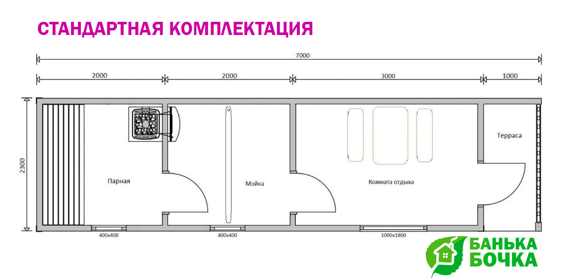 3 отделения (6-7 м) - комната отдыха, помывочная, парная ❗️планировка вагончиком без проходной помывочной. (Проходная помывочная - Доп. опция)