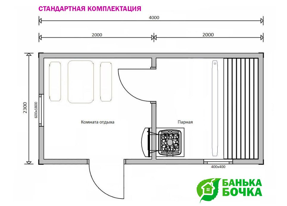 Размер бани: 4 х 2.3 м